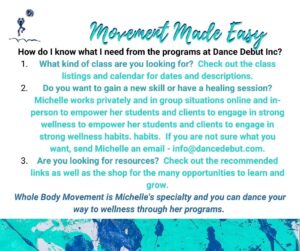 Her classes are focused on three movement areas: Dance, Tai Chi, and Healing Arts.