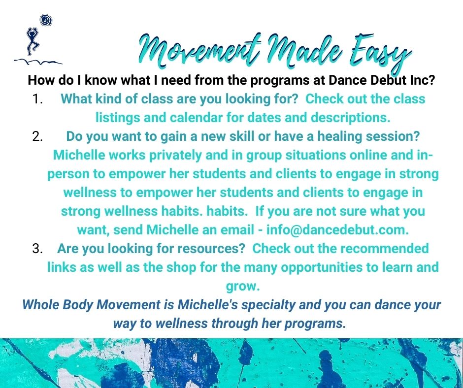 Dance includes weekly classes, workshops, and retreats. Her warm-ups include The Feet First System and Dance YINtegration based on her development of programs from research and experience. She presents for Tap, Ballet, Jazz, Lyrical, Hip Hop, Stepdance, Highland, Musical Theatre, and Contemporary. She includes many aspects of Touch for Health, Whole Body Movement, Brain Gym, Neuro Reflex Integration, Circuits Alive Muscle Tuning, and more in her techniques. Her special development of the Feet First System, Ocean Oasis, Learning Techniques, Injury Recall Technique, Dermatomes, Shock Absorbers, and Biomechanics have created distinct programming that meets the needs of dancers and sports enthusiasts, and supports their goals and challenges. Michelle works with dancers as young as 1 to grand-parenthood and has taught dance companies in Alberta including the Pre-professional Dancers at Decidedly Jazz Danceworks in Calgary, Tri Tone Productions in Calgary, Danceology in Stettler, Footworks Dance Academy in Barrhead, and at many studios across the country including the Tap Dance Center in Toronto.  At the post-secondary level she has also presented at Limerick University in Ireland (Contemporary, Irish, Stepdance, Music Therapy, Dance Therapy, and Faculty). With Michelle’s creative approach to leading experiential opportunities, Michelle educates and prioritizes the needs of the dancer with their learning style, level of skill, and desired outcome for strength, flexibility and creativity.